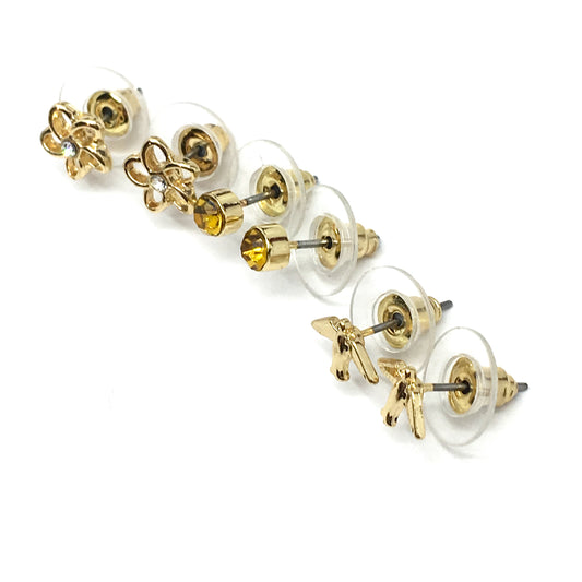 Stud Earrings 3 Pair Assorted Gold Bird Flower Crystal Design