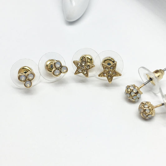 3 Pairs Gold Star Moon Clover Design Crystal Stud Earrings