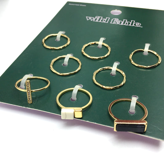 8 Assorted Gold Slim Wavy, Minimalist Bar + Stone Stacking Rings