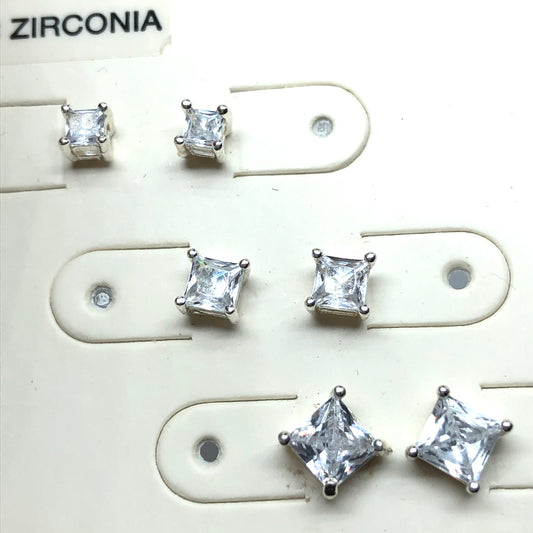 3 Pair of Princess Cut Cubic Zirconia Stone Stud Earrings