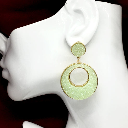 Big Circle Design Kiwi Green Druzy Dangle Earrings