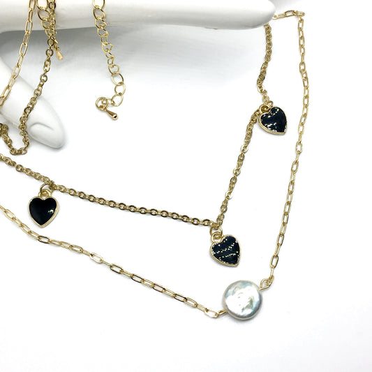 Gold Layering Chain Necklaces Reversible Black Heart, Leaf + Pearl 19in - 14.5in