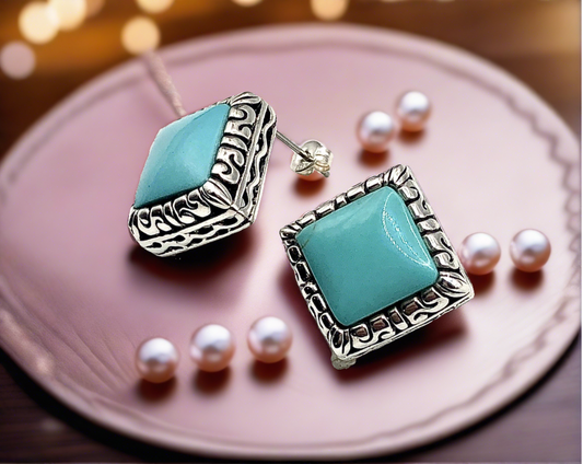 Sterling Silver Earrings, Big Blue Turquoise Stone Square Short Drop Stud Earrings
