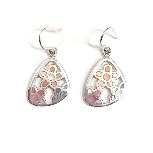 Pastel Pink Blue Peach Flower Design Sterling Silver Dangle Earrings