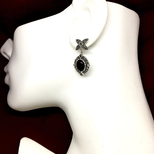 Marcasite Black Onyx Diamond Design Sterling Silver Earrings