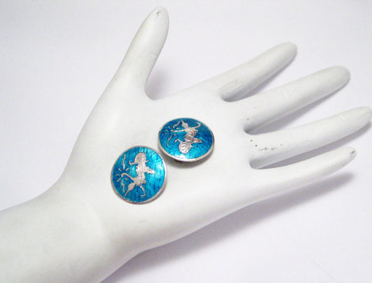 Vintage Sterling Silver Blue Guilloche Siam Goddess Clip-On Earrings