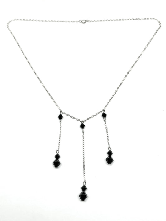 16" Sterling Silver Black Crystal 3 Strand Tassel Necklace