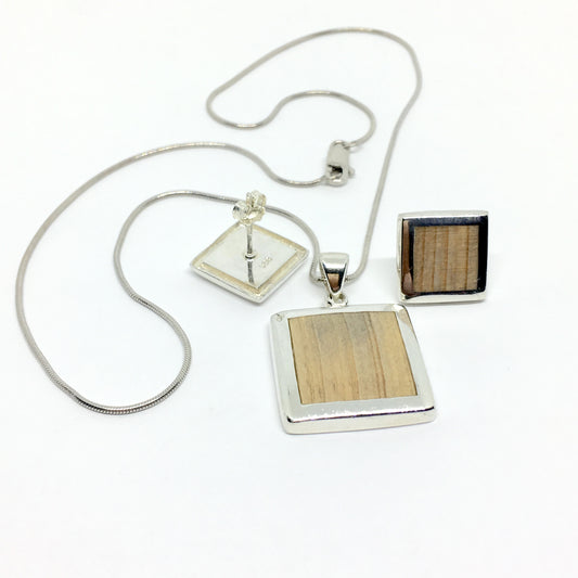 16.25" Sterling Silver Natural Wood Geometric Design Earrings Pendant Necklace set