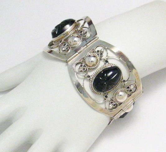 Vintage 1950s FarFan Sterling Silver Carved Golden Obsidian Stone Bangle Bracelet