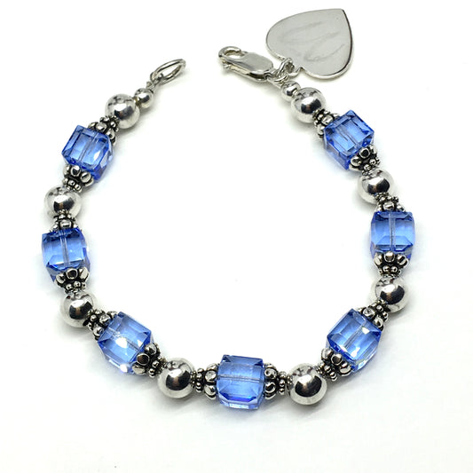Cornflower Blue Crystal Cube cut Beaded Sterling Silver Bracelet 6.75in