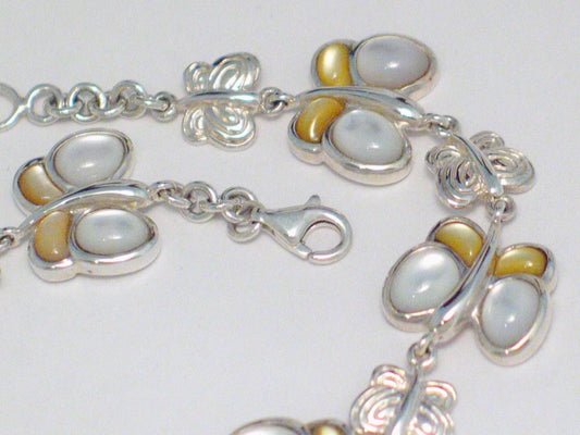 Sterling Silver Bracelet, 7.5" Golden and White Mother of Pearl Stone Butterfly Bracelet