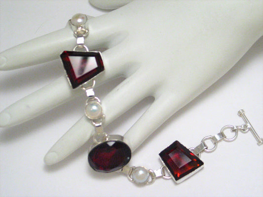 Sterling Silver Tennis Bracelet , 8" Big Chunky Style Red Stone Pearl Bracelet